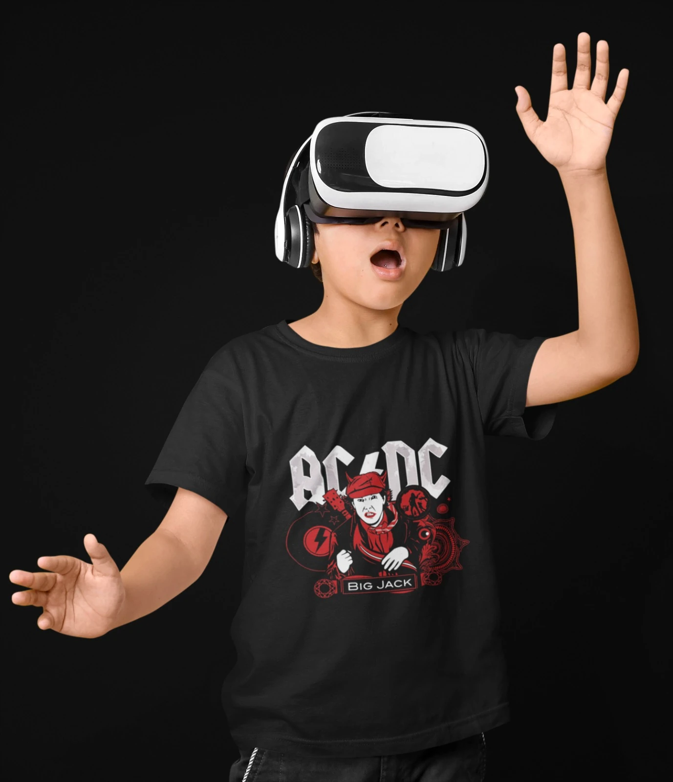 Elevate your rock wardrobe with the AC/DC Big Jack VR Black T-Shirt. This officially inspired tee features a striking graphic of a young rocker in a VR headset, complete with the iconic AC/DC logo, Big Jack text, and energetic design elements in red and white on a premium black cotton fabric. Ideal for concert-goers, band enthusiasts, or anyone loving 80s metal vibes. Made for comfort and style, available in various sizes for the whole family.
