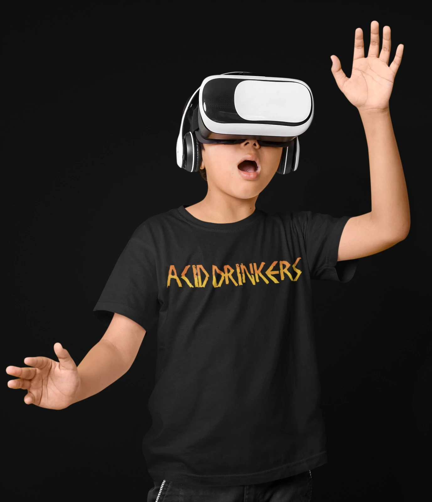 Elevate your wardrobe with the Acid Drinkers Black T-Shirt, featuring the bold, fiery orange band logo prominently displayed. Captured on a young model in VR goggles with an excited pose, this tee blends thrash metal heritage with modern virtual reality flair. Made for fans of Polish rock legends Acid Drinkers, it’s lightweight, slim-fit unisex crew neck perfect for concerts, gaming sessions, or casual wear. High-quality DTG print ensures vibrant, long-lasting design. Available in multiple sizes.