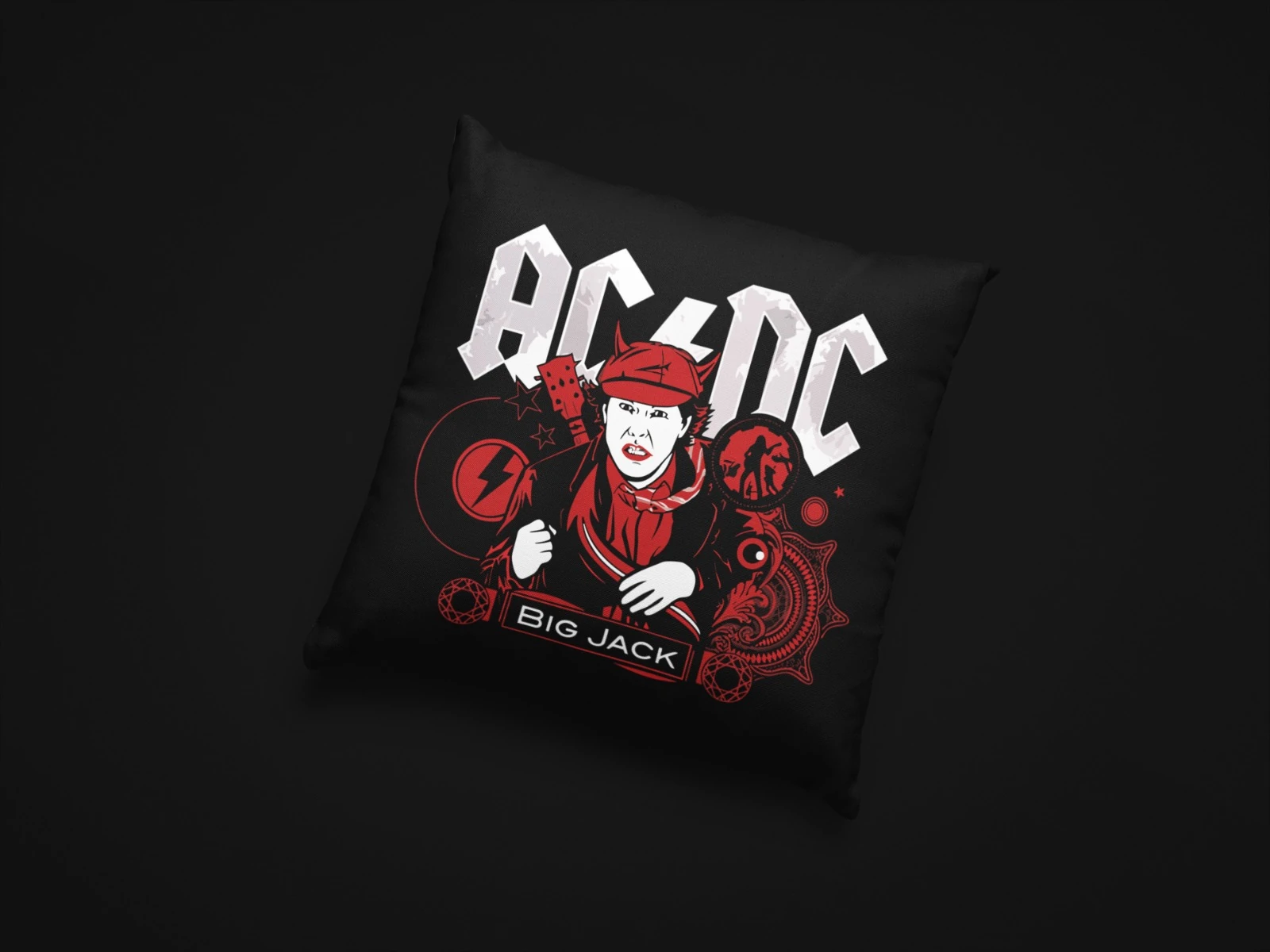 Bring high-voltage rock energy into your space with this AC/DC Big Jack black throw pillow. The design features bold white AC/DC lettering above a vivid red and white illustration inspired by the Big Jack era, complete with guitar, lightning bolt, and ornamental graphic details. Printed on a deep black background, the artwork stands out as a dramatic focal point on any sofa, bed, or chair. Ideal for fans of classic rock, this accent pillow adds attitude to living rooms, bedrooms, studios, or entertainment areas. Use it as a statement piece on its own or combine it with other band-themed decor to create a powerful music-inspired interior.