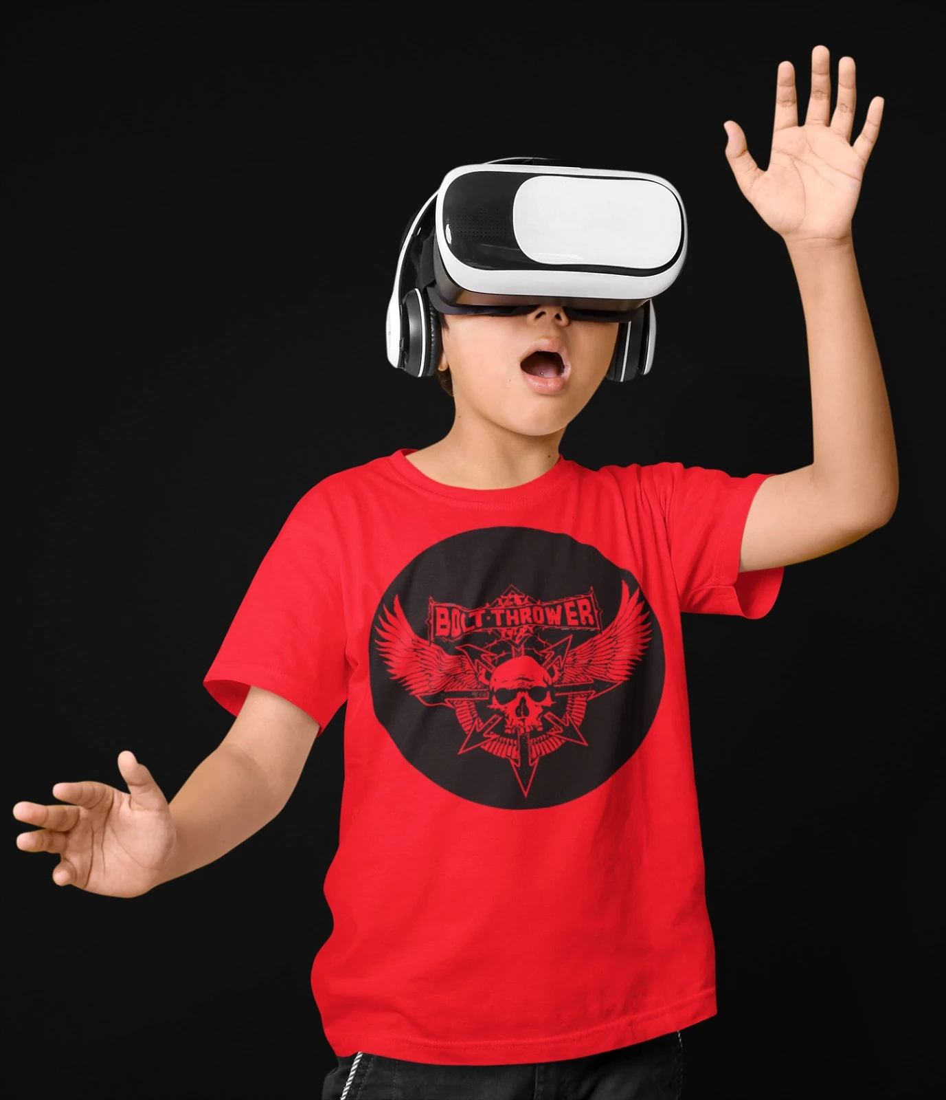 Elevate your rock wardrobe with the official Black Crowes red t-shirt showcasing the legendary flying crowes band logo encircled by a striking skull and dagger motif. Captured on a dynamic model wearing a VR headset, this short-sleeve tee blends classic southern rock vibes with modern virtual reality flair. Made for concerts, gaming sessions, or casual wear, it’s the ultimate merch for Black Crowes enthusiasts seeking authentic band apparel with bold black and red graphics on premium cotton fabric.