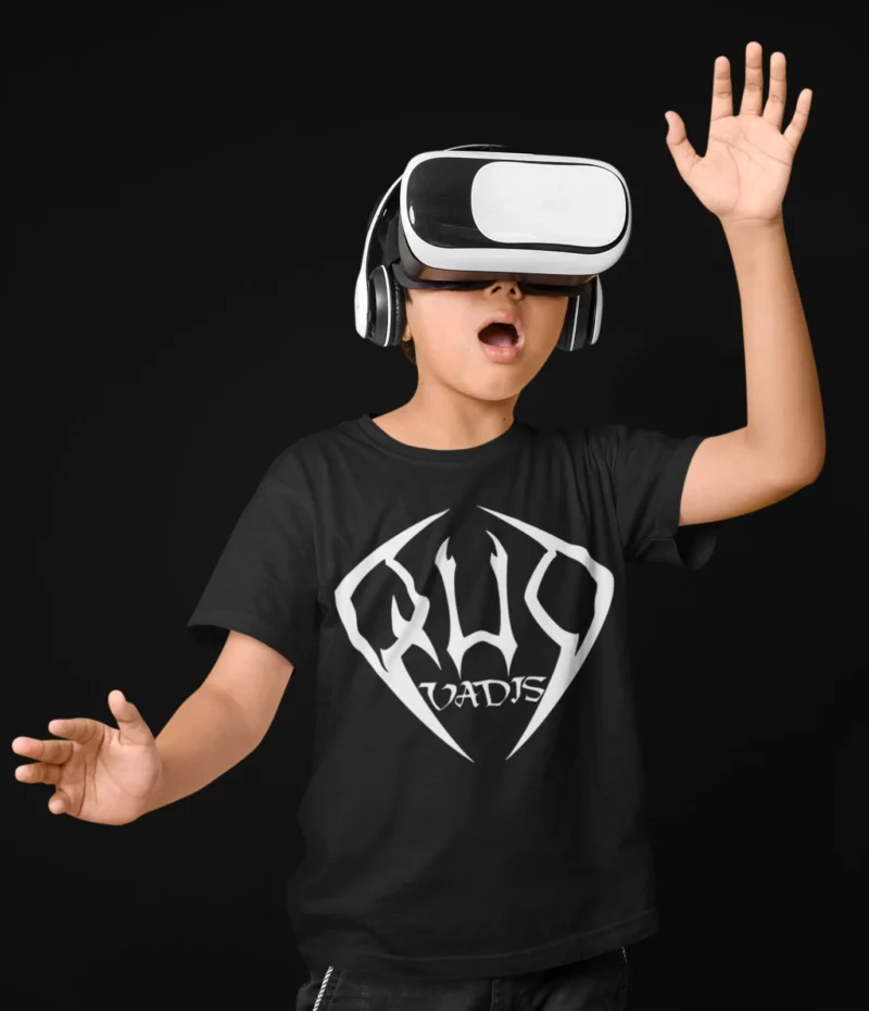 Elevate your gaming style with this premium black t-shirt showcasing the striking white Raqwadis logo and a dynamic image of a child immersed in VR gaming adventure. Ideal for kids and teens who love virtual reality, esports, and futuristic tech. Crafted for comfort and durability, this apparel piece combines bold graphics with high-quality cotton fabric to withstand active play. Perfect gift for birthdays, holidays, or any occasion for young gamers exploring virtual worlds.