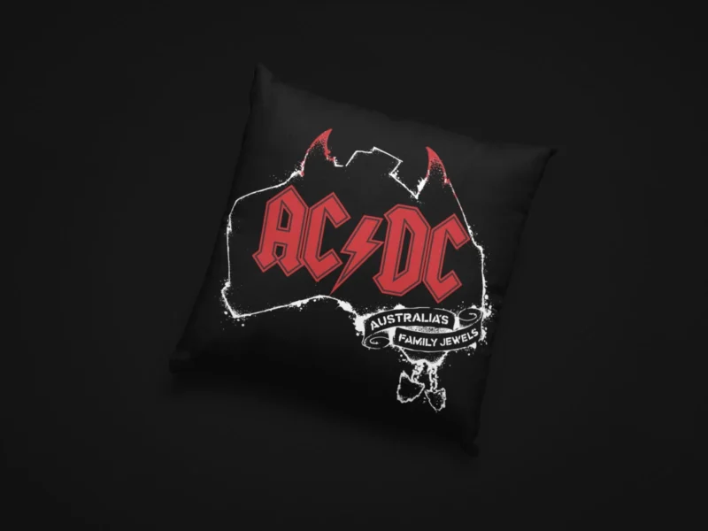 Stylish black AC/DC throw pillow with bold red logo and Australia’s Family Jewels graphic, perfect for rock fans and music-themed rooms.