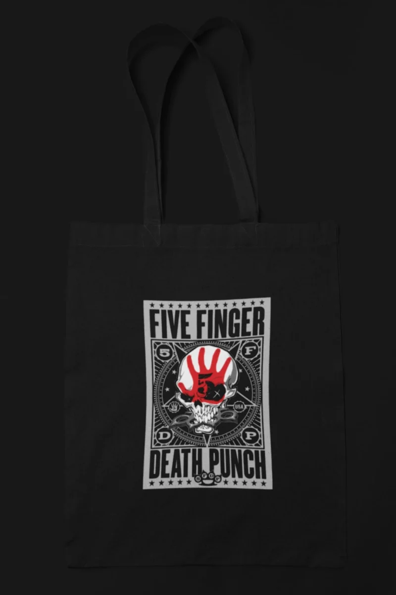 Carry your gear in heavy metal style with this black tote bag featuring the iconic Five Finger Death Punch skull logo in yellow and red.