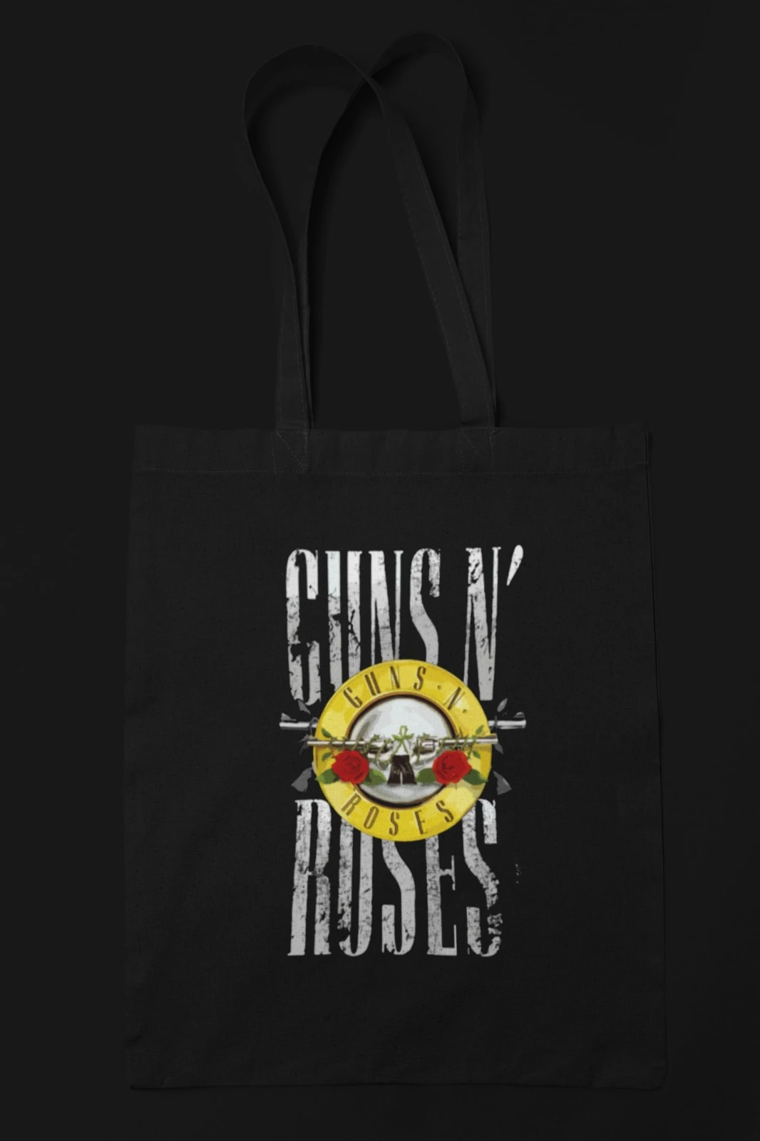 Black canvas tote bag printed with the iconic Guns N’ Roses logo and emblem, perfect for everyday rock-inspired style.
