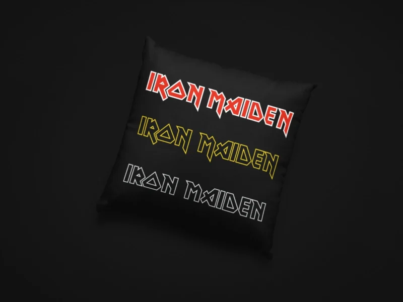 Add heavy metal attitude to your space with this black Iron Maiden inspired throw pillow. The design features three bold logo-style text prints arranged vertically across the front: a striking red and white version at the top, a sharp yellow and black version in the center, and a clean white outlined version at the bottom. The dark background makes each color pop, creating a powerful graphic look that stands out on any sofa, bed, or chair. Ideal for rock and metal fans, this cushion combines comfort with iconic band-style typography, making it a perfect accent piece for music rooms, bedrooms, studios, or living areas.