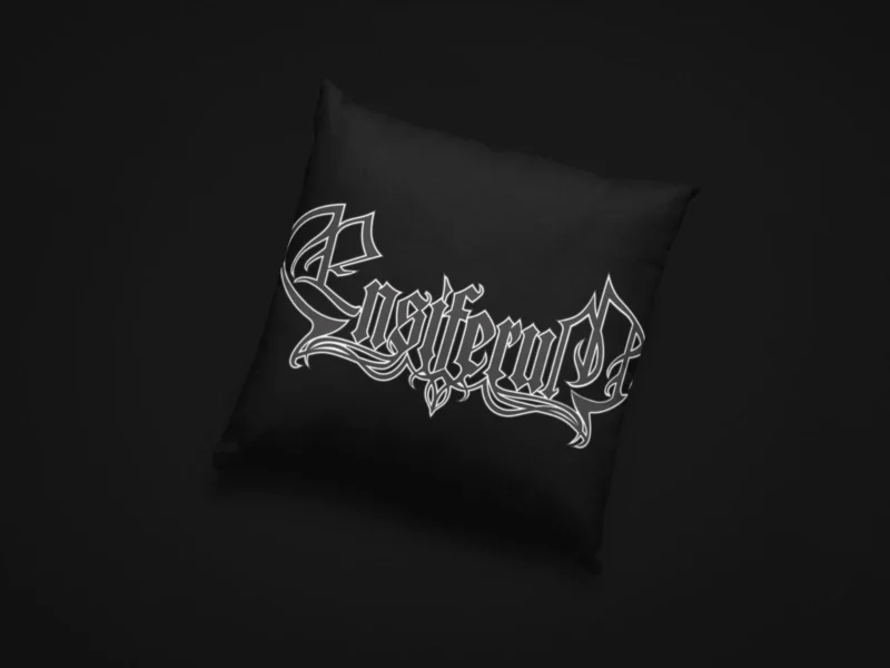 This black metal logo throw pillow is designed for fans of dark aesthetics and heavy music. The cushion features a bold white band-style logo printed in intricate, gothic typography across the front, creating a dramatic high-contrast look. Made for use on sofas, chairs, or beds, this decorative pillow adds an edgy focal point to any room. Ideal for home studios, living rooms, or bedrooms, it combines comfort with a striking monochrome design that suits modern, minimalist, or alternative interiors.