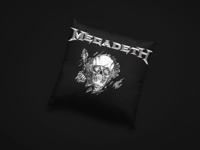 Elevate your space with this bold black throw pillow featuring a striking skull illustration framed by a metallic-style band logo. The high-contrast white and silver artwork pops against the deep black background, creating a dramatic focal point on your sofa, chair, or bed. Designed for rock and metal fans, this pillow brings concert poster energy into your home decor. Crafted for both style and comfort, it works perfectly in living rooms, bedrooms, studios, or game rooms. Use it as a standout accent piece on its own or mix it with other dark, edgy cushions for a cohesive heavy-metal inspired interior.