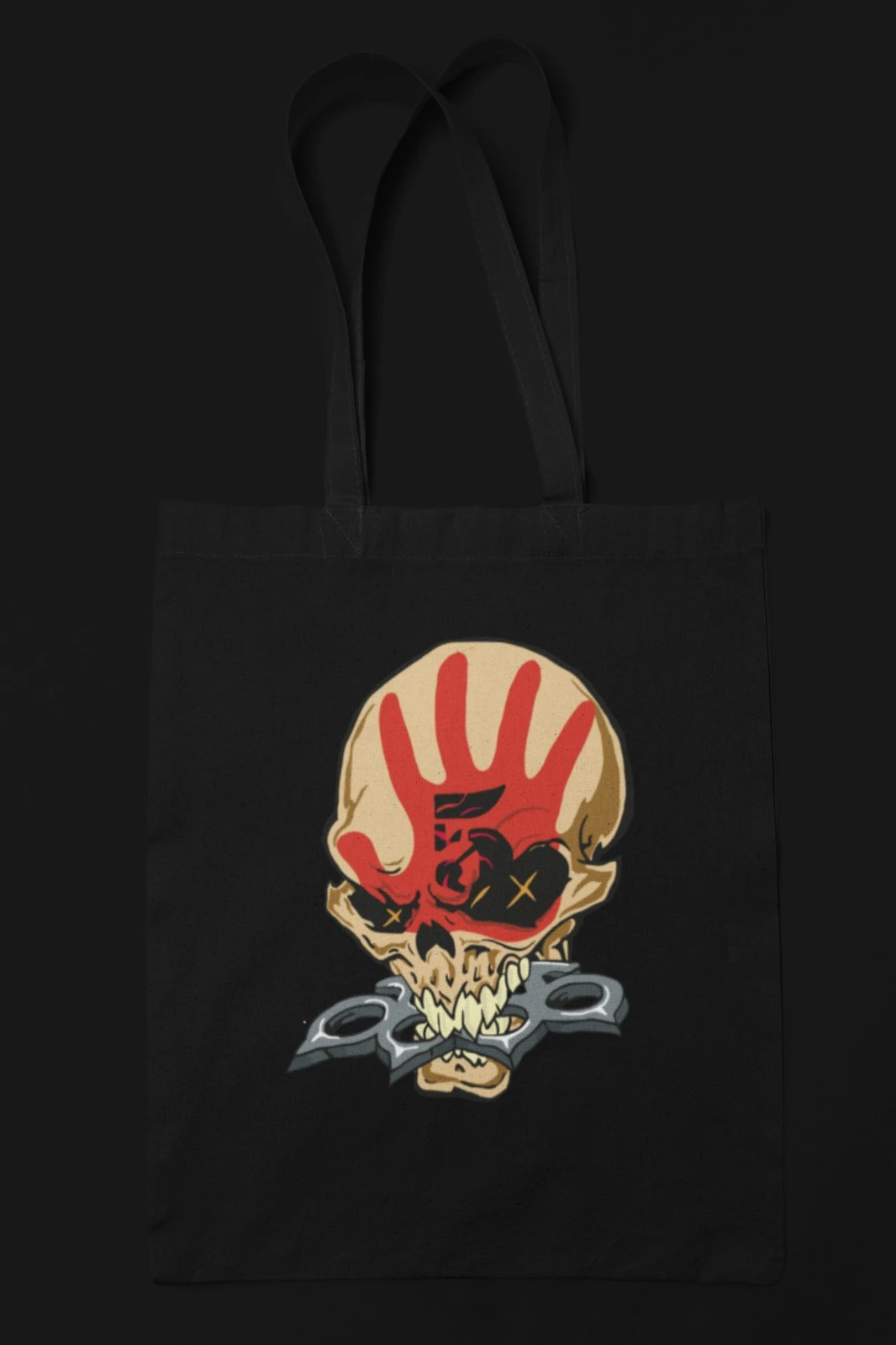 This black tote bag features a bold illustrated skull graphic that instantly grabs attention. The design shows a stylized beige skull with a vivid red handprint across the forehead and dark eye sockets marked with Xs for a rebellious, edgy look. Clenched between the skull’s sharp teeth is a metallic knuckle duster, adding a hardcore street and rock influence to the artwork.