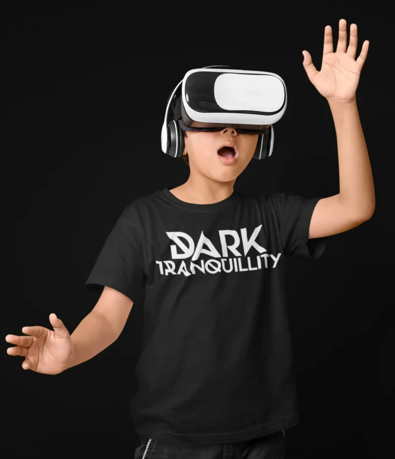 Fun black Dark Tranquillity t-shirt with white logo, styled with VR headset on a kid model. Perfect melodic death metal fan apparel.