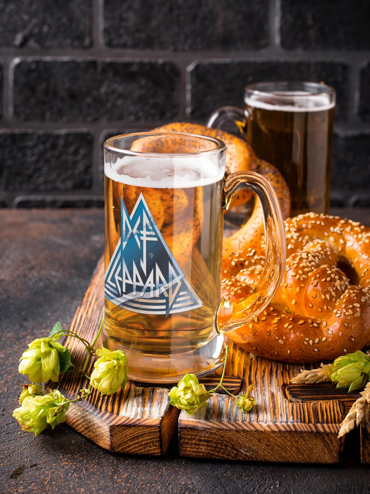 Authentic Def Leppard beer mug featuring the band’s legendary geometric logo. Perfect for rock music fans and collectors.