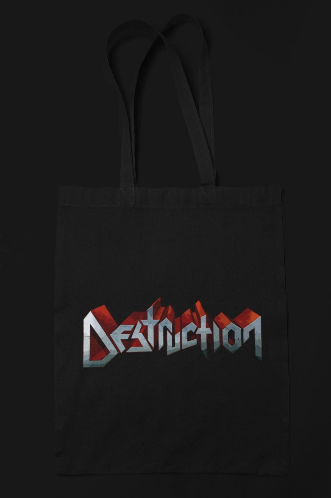 Carry your essentials in this black tote bag featuring the iconic Destruction band logo in bold red and metallic gray.