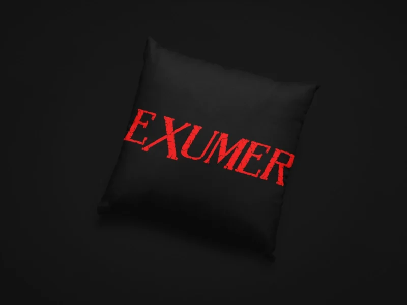 Add a heavy metal edge to your space with this black EXUMER logo throw pillow. The cushion features the bold EXUMER wordmark printed in vivid red, using a distressed, grunge-style font that stands out sharply against the deep black background. Made for fans of thrash metal and dark modern decor, this pillow is ideal for a sofa, bed, or studio. Its simple yet striking design brings concert poster energy into your living room while remaining comfortable enough for everyday lounging.