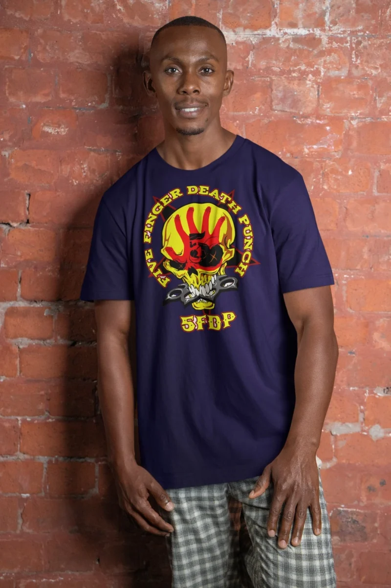 Elevate your wardrobe with this striking Five Finger Death Punch Hand Skull Logo T-Shirt in deep purple. The front boasts a massive circular emblem showcasing a fierce red hand forming a skull, surrounded by ‘FIVE FINGER DEATH PUNCH’ in fiery yellow lettering and ‘FFDP’ accents. Crafted for comfort and durability, this tee captures the band’s aggressive groove metal energy and military-inspired imagery. Ideal for concerts, casual wear, or showing loyalty to Ivan Moody and crew. Available in multiple sizes for the ultimate fan statement.