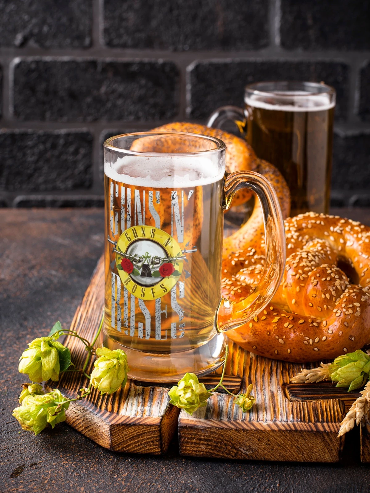 Elevate your beer game with this Guns N’ Roses beer mug, showcasing the legendary band logo in a clear glass design perfect for fans and collectors.