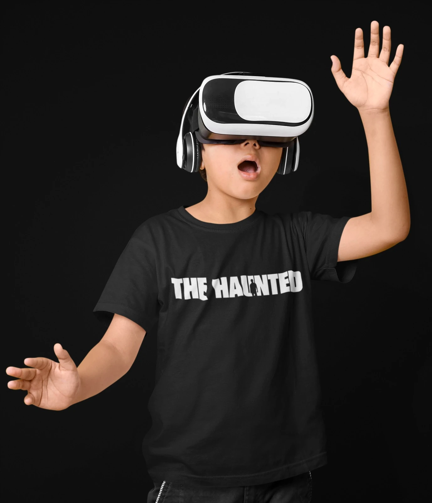 Fun black t-shirt for kids showing excited child in VR headset with ‘THE HAUNTED’ design. Ideal for gaming fans.
