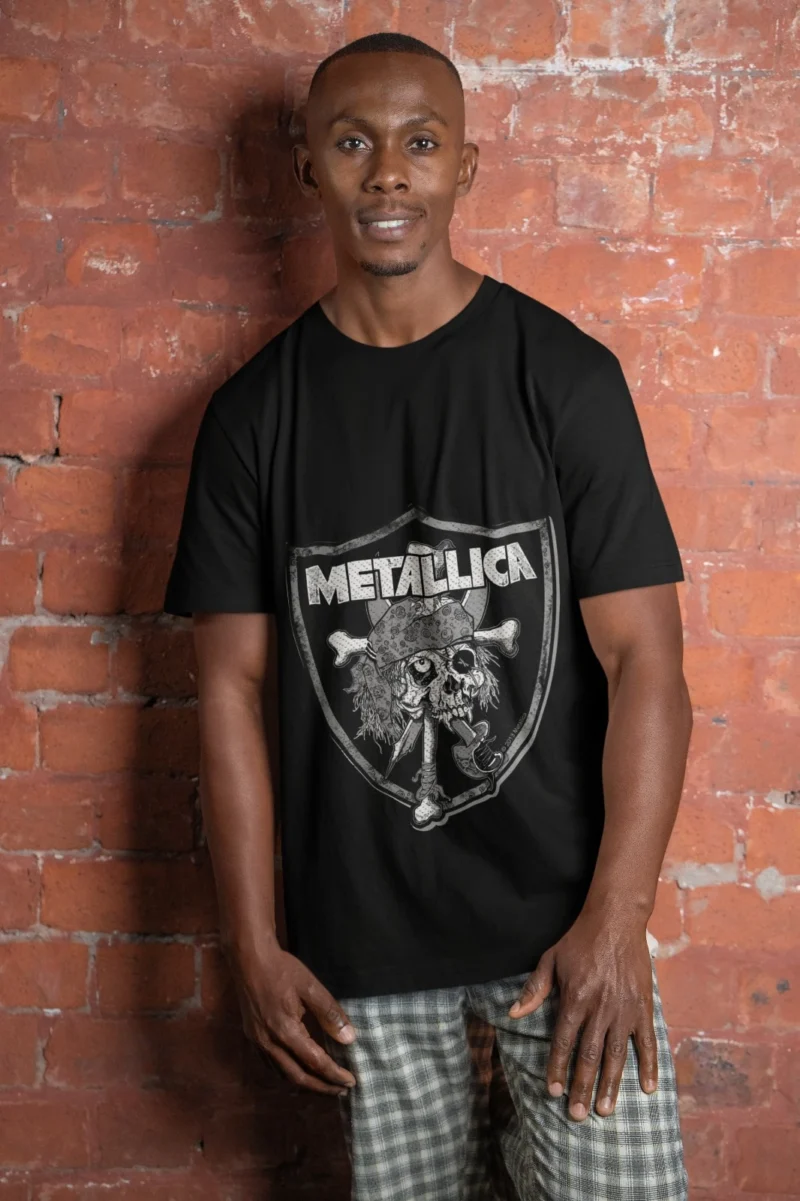 Authentic Metallica band t-shirt featuring an iconic skull and crossbones shield design. This black crew neck tee showcases distressed grayscale artwork with the Metallica logo, delivering that classic heavy metal aesthetic. Perfect for longtime fans and collectors of band merchandise. Made from quality cotton with a comfortable standard fit and short sleeves.