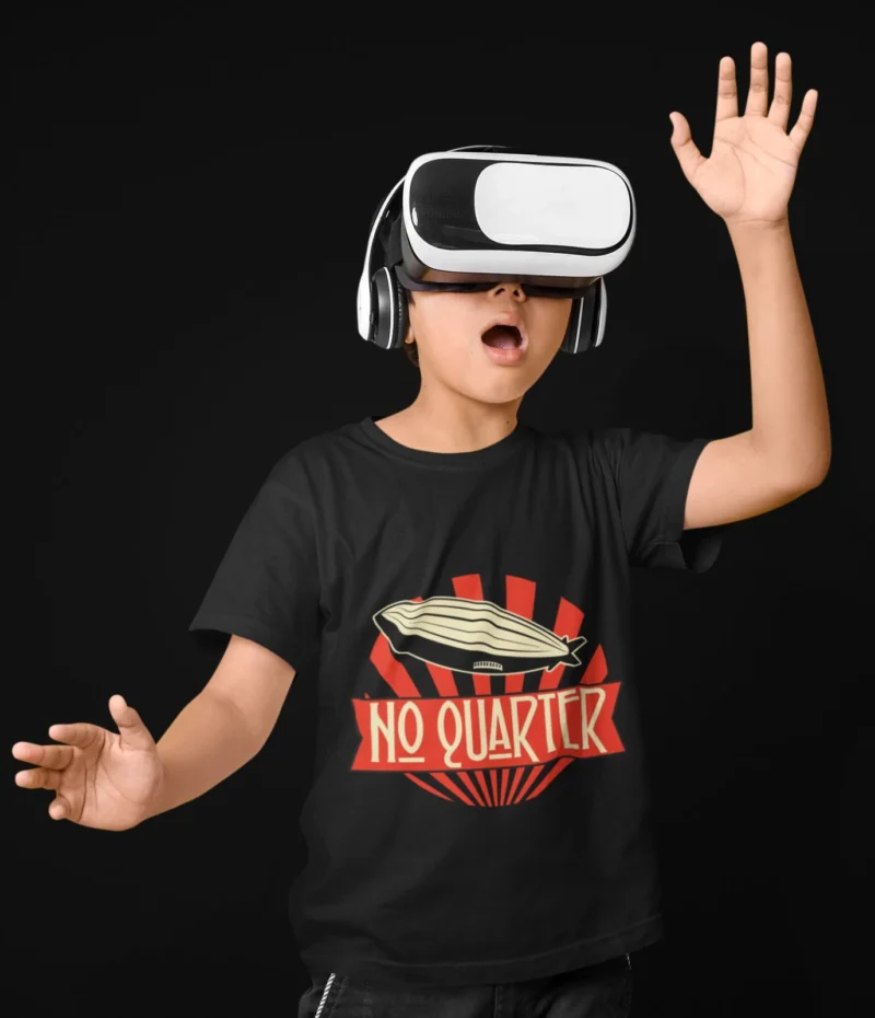 Premium quality black t-shirt featuring a striking vintage-inspired graphic design showcasing an airship with ‘NO QUARTER’ text in bold red lettering and cream accents. Perfect for those who appreciate bold, statement-making apparel with a retro aesthetic. Made from soft, comfortable cotton fabric suitable for all-day wear.