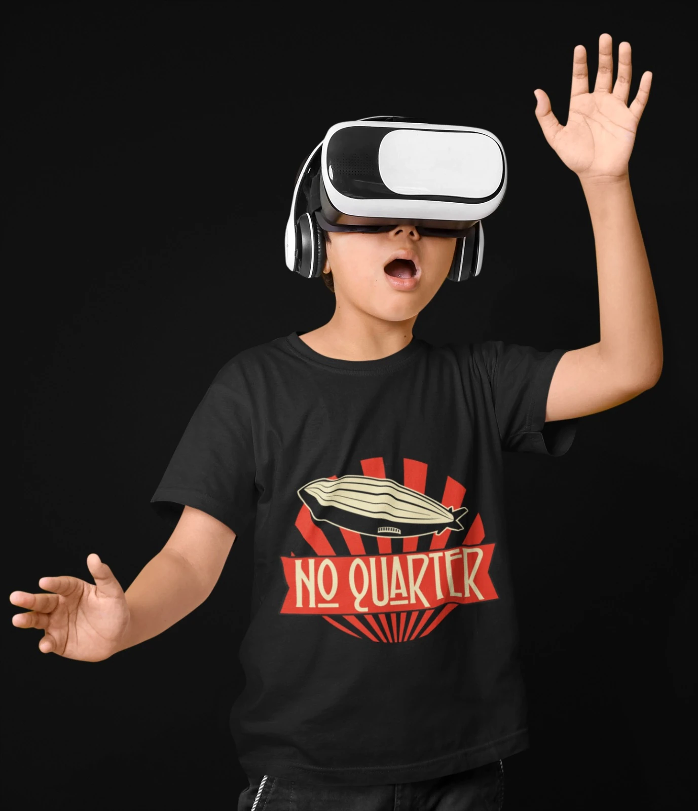 Bold black t-shirt with retro airship design and NO QUARTER branding in red and cream.
