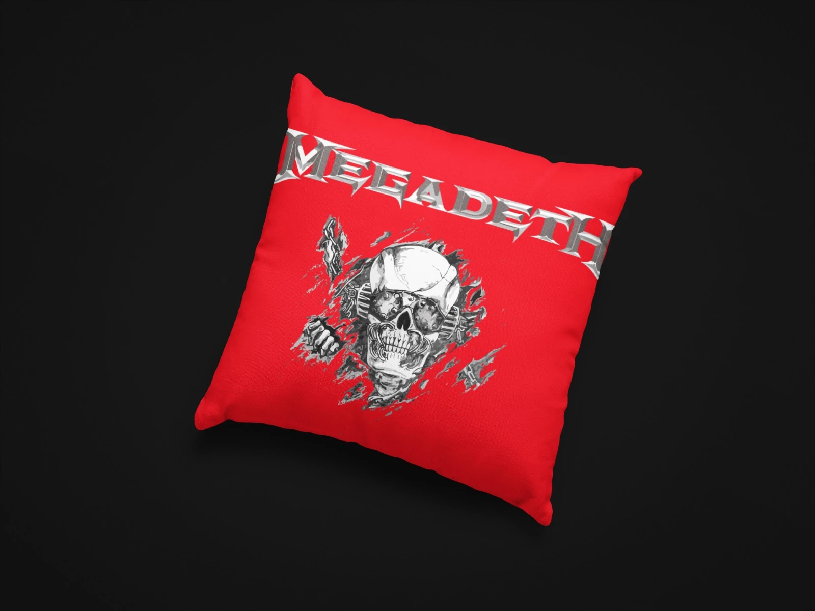 Show your love for Megadeth with this vibrant red throw pillow featuring the iconic band logo and skull design. Perfect for any heavy metal fan’s home decor.