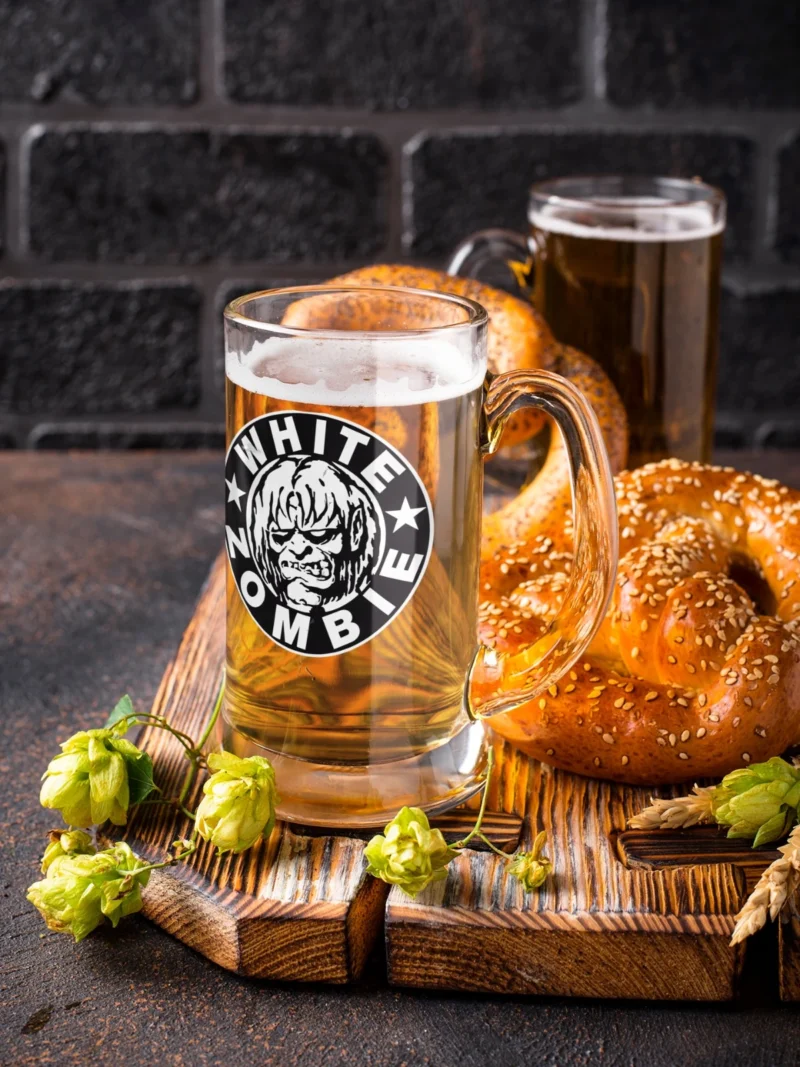 Elevate your beer game with this black White Zombie logo beer stein mug, perfect for rock enthusiasts and craft beer lovers alike.